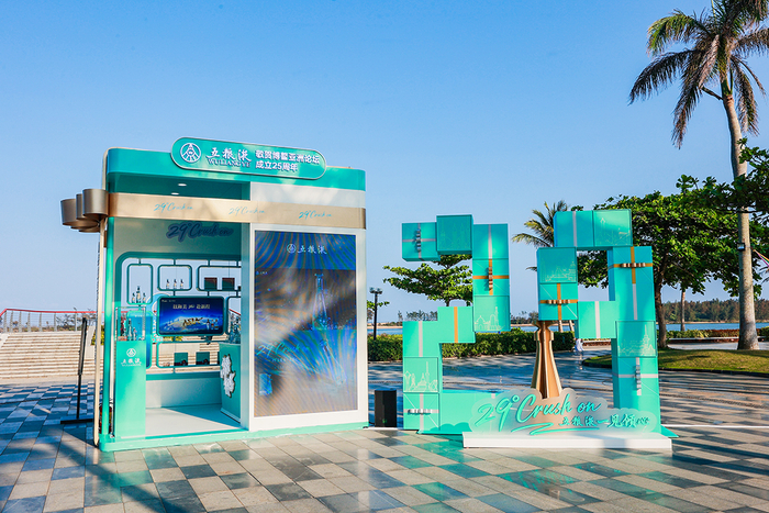户外,五粮液·一见倾心户外品牌快闪以“打开的礼物”为造型,以29°五粮液·一见倾心的天青色为基调,内部错落展示产品,外侧则以融入29个成员国标志性建筑剪影的礼盒搭建起数字'29'造型,吸引众多嘉宾纷纷前来拍照、打卡、品鉴。