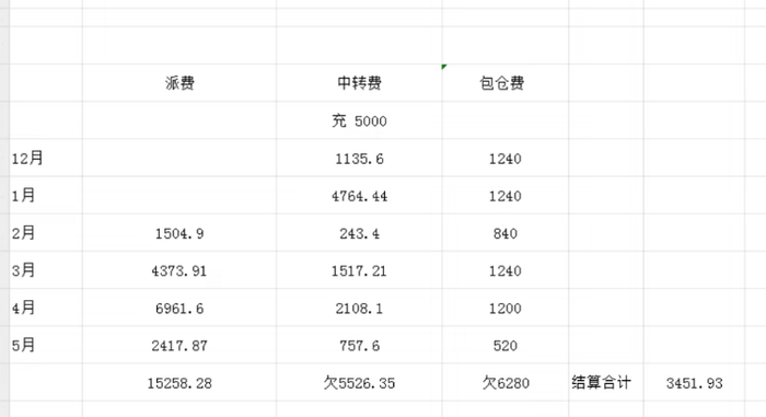 但经历了考核扣派费,扣税、扣管理费、扣罚款这么几道流程下来,只剩下15258.28元了。此外还得扣中转费和包仓费,干半年的收入只有3451.93元。