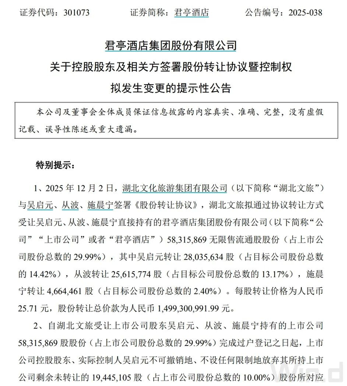项乾消息:12月2日,杭州上市公司君亭酒店(301073.SZ)公告称,湖北文旅拟以每股25.71元,总价款14.99亿元受让公司股东吴启元、从波、施晨宁持有的公司5832万股股份,占公司股份总数的29.99%。