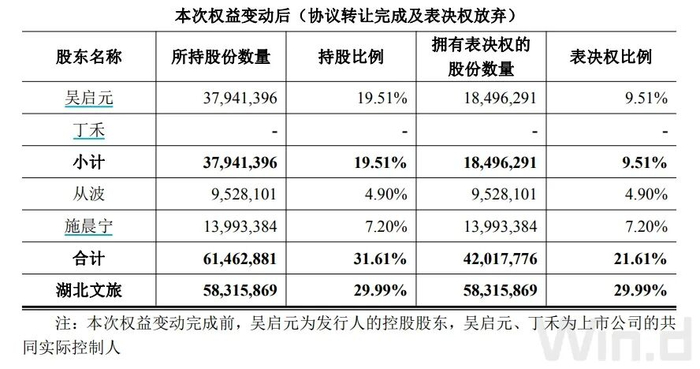 交易完成后,湖北文旅将拥有上市公司36.00%的股份及该等股份对应的表决权,吴启元及其一致行动人丁禾合计拥有上市公司19.51%的股份及该等股份对应的表决权。上市公司控股股东变更为湖北文旅,实际控制人变更为湖北省国资委。