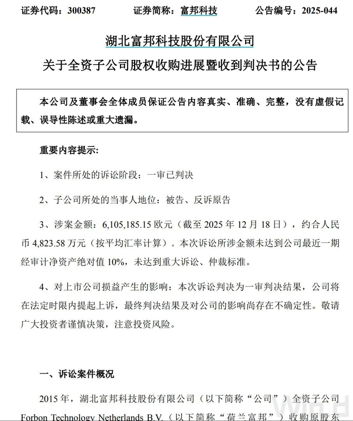 12月19日,富邦科技(300387)发布公告,公司的全资子公司荷兰富邦与HNC的股权转让合同纠纷案,收到荷兰阿姆斯特丹法院的一审判决。
