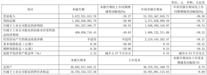 山煤国际2025年第三季度报告主要财务数据。(图片来源:上海证券交易所官网)从财务数据来看,山煤国际2025年第三季度及前三季度经营业绩面临较大压力。财报披露,第三季度,公司实现营业收入56.73亿元,同比下降28.27%;归母净利润3.91亿元,同比大幅下滑50.53%,基本每股收益0.20元/股,同比降幅亦达50%。