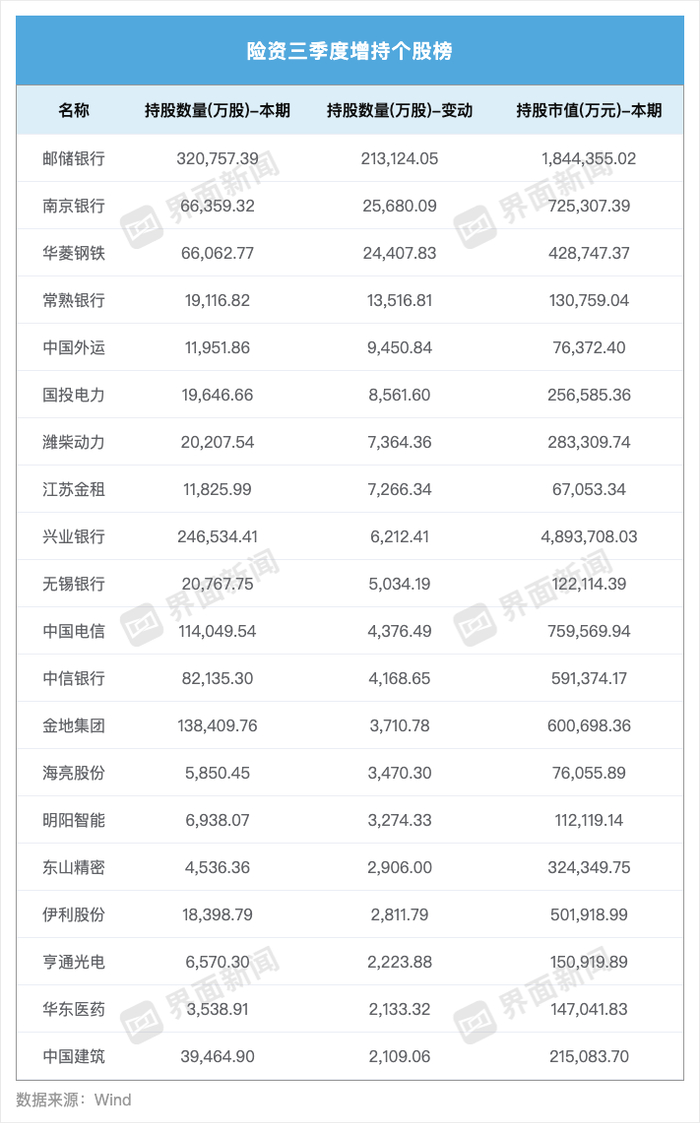 界面新闻记者根据Wind数据整理制图从持股变动角度看,三季度险资大幅加仓邮储银行,其中平安人寿加仓21.89亿股,中国人寿减持5793万股。其次是南京银行,中国人寿保险股份有限公司-传统-普通保险产品在三季度加仓2.57亿股。