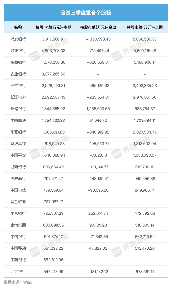 界面新闻记者根据Wind数据整理制图从个股角度看,除去中国人寿与平安银行,银行股仍是险资的重仓股。浦发银行(600000.SH)、兴业银行(601166.SH)、招商银行(600036.SH)、农业银行(601288.SH)、民生银行(600016.SH)、长江电力(600900.SH)、邮储银行位于险资重仓股排行榜前列。