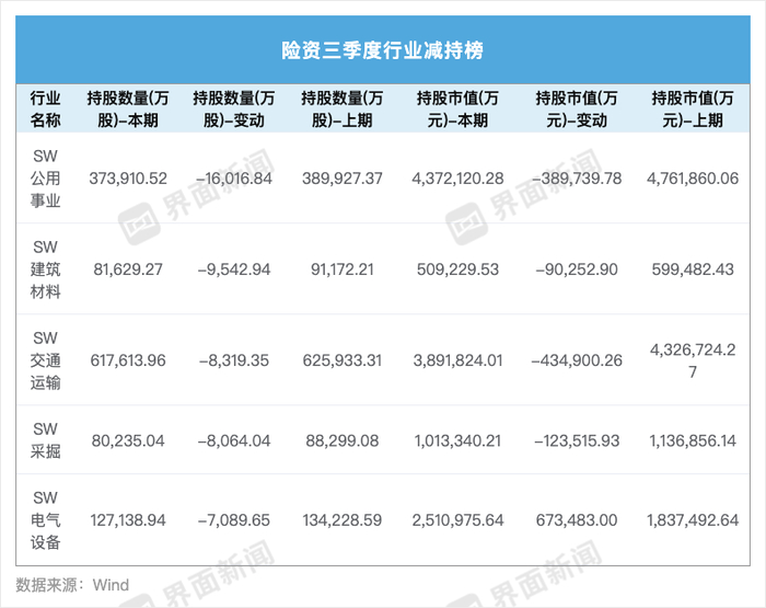 行业减持方面,三季度,险资大幅减持公共事业、建筑材料、交通运输等行业,分别共计减持1.60亿、9542.94万、8319.35万股,持股市值分别减少38.97亿、9.03亿、43.49亿元。主要减持内蒙华电(600863.SH)、濮耐股份(002225.SZ)、招商轮船(601872.SH)、招商公路(001965.SZ)等个股。