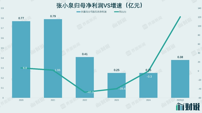 即便2024年营收实现同比增长,张小泉净利润仍未扭转颓势。直至2025年9月,公司净利润才回升至3898万元,受益于低基数效应,同比增长120.78%,实现恢复性增长。
