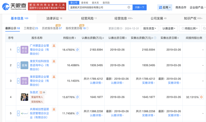 蓝箭航天的第二大股东,为湖州星瀚信息技术服务合伙企业(有限合伙),这家公司的受益人是蓝箭航天创始人张昌武。