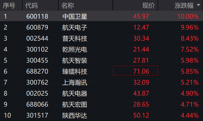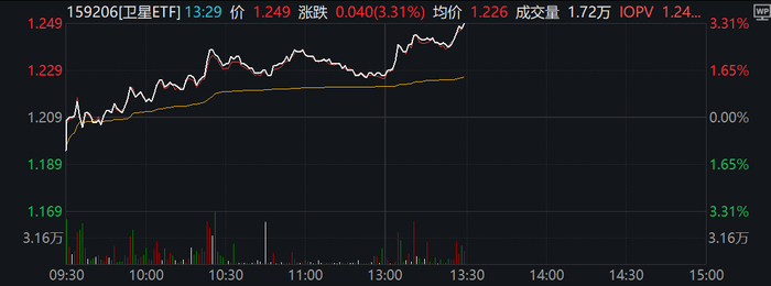 今日午后,卫星ETF(159206)上涨超3%。成分股中国卫星(600118)、航天电子(600879)涨停,普天科技(002544)、乾照光电(300102)等个股跟涨。