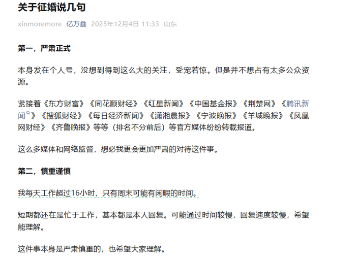 12月4日,他新近发布了一篇《关于征婚说几句》对该事件做出了相关说明。他表示,并不想占有太多公众资源。“我每天工作超过16小时,只有周末可能有闲暇的时间。短期都还是忙于工作,基本都是本人回复。可能通过时间较慢,回复速度较慢,希望能理解。这件事本身是严肃慎重的,也希望大家理解。”