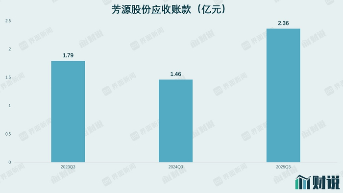 其次是应收账款激增。截至9月底,芳源股份应收账款达2.36亿元,同比大增62%。在营收微增5.29%的情况下,应收账款大幅增长,说明公司可能为了维持销售规模,放宽了信用政策,导致货款回收延迟。“应收账款激增表明公司的资金被下游客户占用,这也会进一步加剧公司的现金流压力。” 林悦奕分析称。