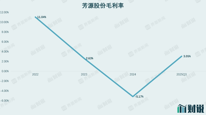 更为严峻的是,芳源股份的盈利能力持续恶化。2023年公司毛利率为2.63%,2024年下滑至-5.17%,2025年前三季度虽回升至3.05%,但仍处于行业低位。“3% 左右的毛利率几乎没有抗风险能力,一旦原材料价格出现小幅波动,就很容易再度陷入亏损。” 注册会计师林悦奕对界面新闻记者表示。