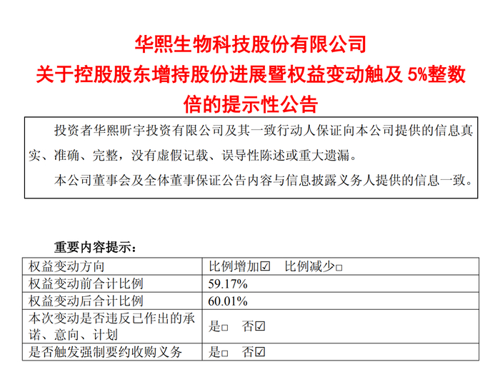 公司在本轮增持前,于9月份发布的《关于控股股东增持股份进展暨权益变动触及5%整数倍的提示性公告》显示,这次增持计划实施完毕后,控股股东及其一致行动人合计持有公司股份比例由59.17%增加至60.01%。