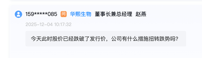 2025年12月4日,华熙生物在上证路演平台召开2025年第三季度业绩说明会。投资者向公司董事长兼总经理赵燕发出提问:“今天此时股价已经跌破了发行价,公司有什么措施扭转跌势吗?”