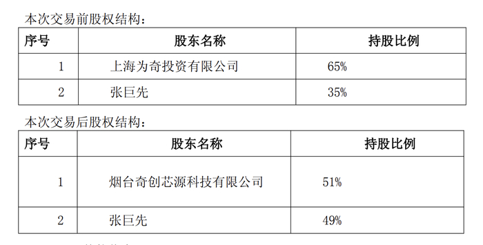 公告截图从交易结构来看,本次股权转让分为两部分实施:其中51%股权作价1707.48万元,转让给关联方烟台奇创;剩余14%股权作价468.72万元,转让给睿瓷新材法定代表人张巨先。