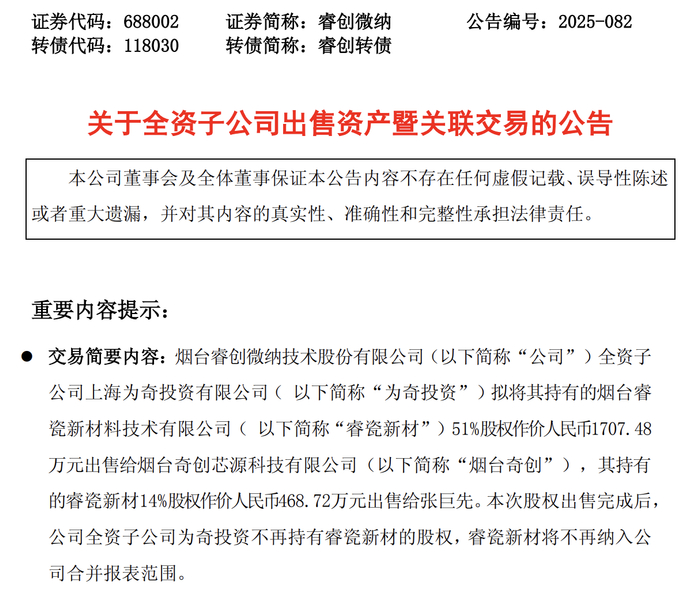 公告截图值得注意的是,此次交易的接盘方之一为烟台奇创芯源科技有限公司(以下简称“烟台奇创”),其控股股东为睿创微纳实际控制人马宏;同时,睿创微纳副董事长、副总经理赵芳彦兼任睿瓷新材董事长。据此,本次交易构成关联交易。