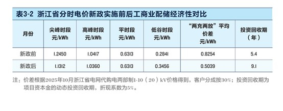 分时电价调整后,浙江省的平均电价差从0.83元/千瓦时缩小至0.50元/千瓦时,投资回收期由5.4年变为9.1年