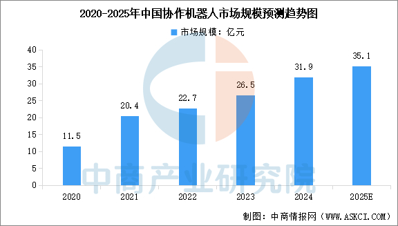 在工业自动化升级与柔性制造需求推动下,协作机器人这一细分市场呈现了更为显著的增长态势。根据中商情报网的数据,中国协作机器人市场规模已从2020年的11.5亿元快速攀升至2024年的31.9亿元,并预计在2025年达到35.1亿元。