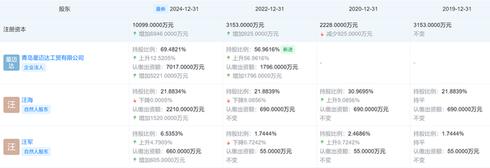 2024年,星迈达再度增持股份至69.48%,汪海持股比例被稀释至21.88%,退居第二大股东,儿子汪军仅持股6.53%(经核实,汪军该部分持股与星迈达无一致行动协议)。如今的双星名人集团股权结构分散,徐英通过星迈达成为企业实际控制人,汪海尽管名义上仍是董事长,却已失去对企业的绝对控制权。