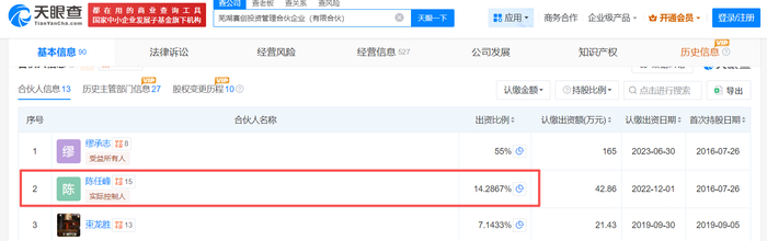 其中,芜湖佑能创业投资合伙企业(有限合伙)由陈任峰等15人共同持股,陈任峰出资67.4365%。