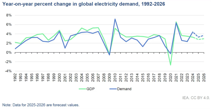 而不止国内,全球用电缺口几乎都在增大,根据IEA《电力2025》的数据,2024年全球电力需求达到29038太瓦时(TWh),同比增幅达到4.3%——不仅高于2023年的全球电力需求增速,也高于2024年全球能源需求增速(2.2%),以及同年的全球GDP增长率(国际货币基金组织统计口径:3.2%,世界银行统计口径:2.9%)。而设其中AI算力的用电量的增长显而易见。