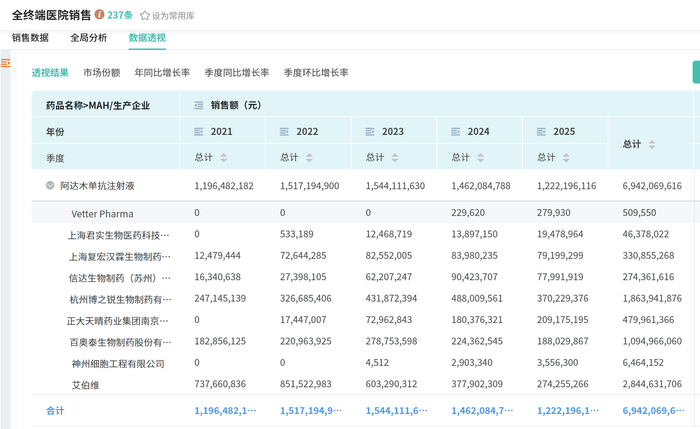 不过,博锐生物却是在国内把阿达木单抗卖得最好的企业。虽然博锐生物的安健宁®甚至不是首仿产品。它的获批时间晚于首仿百奥泰的格乐立®。而据摩熵医药数据库,2021年起,安健宁®就一直是国内仅次于原研药修美乐®的销冠;2024年之后,安健宁®超越修美乐®成为了本土销售额最高的阿达木单抗。