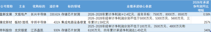 界面新闻统计近两年A股市场同类并购案例业绩承诺情况发现,溢价收购半导体设备、存储芯片封测领域多例并购案中,多数标的的业绩承诺呈现出较高的增长性。
