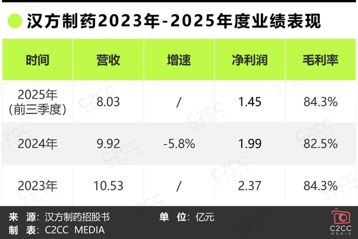 根据招股书披露的核心财务数据,2023年汉方制药实现营收10.53亿元,净利润2.37亿元,毛利率高达84.3%;2024年营收微降至9.92亿元,净利润1.99亿元,毛利率仍保持在82.5%的高位;2025年前三季度,公司营收8.03亿元,净利润1.45亿元,毛利率回升至84.3%。