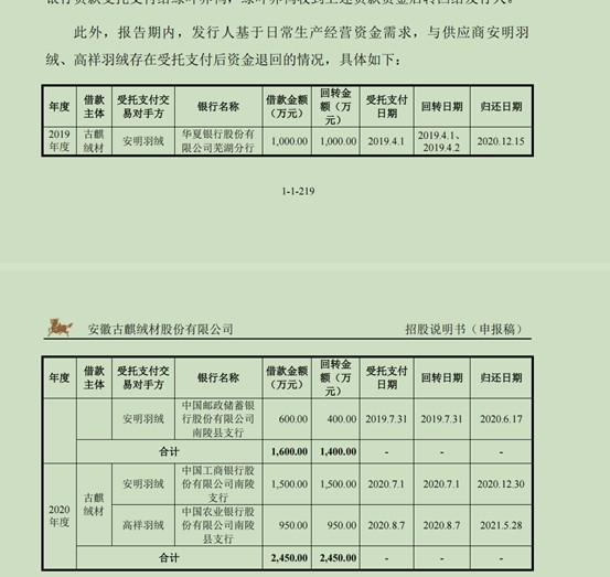 图片来源:天眼查APP此外,界面新闻记者还发现,古麒绒材与安明羽绒、高祥羽绒曾有过“受托支付后资金退回”的转贷交易,相关款项总额为2450万元。该操作在财务审计中,属于典型的转贷行为。