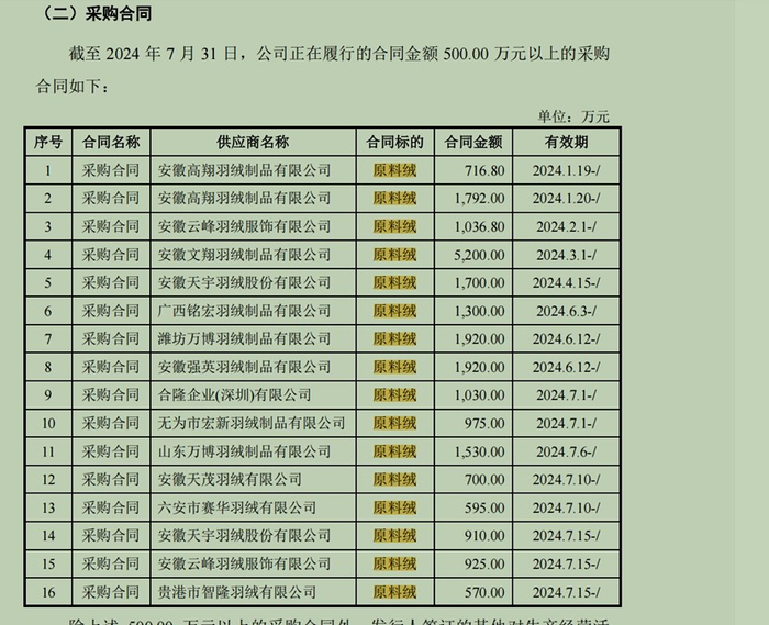 招股书显示,2024年上半年,安明羽绒还是古麒的第二大供应商(采购额3600万),但在截至2024年7月31日高于500万元的采购合同中,却看不到这家公司的身影。取而代之的供应商大都位于无为市周边甚至外省,古麒绒材所在的南陵县已经没有一家大型供应商。
