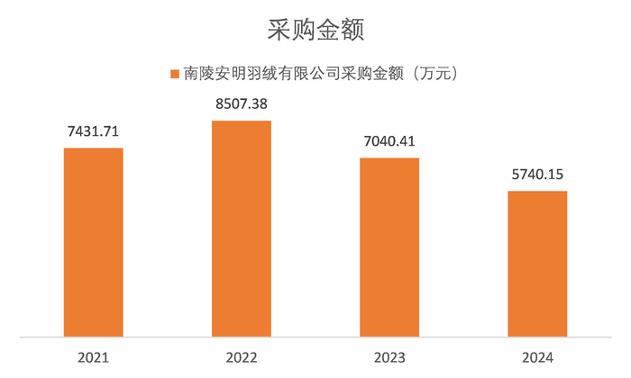 古麒绒材将安明羽绒列为稳定合作伙伴,2021至2023年年均向后者采购超7000万元,2024年则有超5700万元的采购体量。这样的采购规模相当于一家中型羽绒加工企业的全年营收体量。