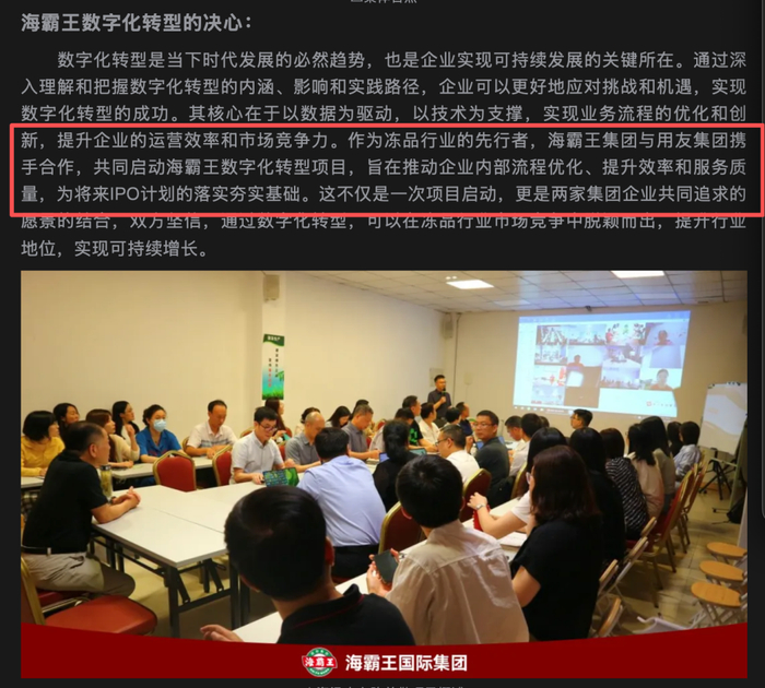 更重要的是,海霸王或正谋划IPO。2024年7月,官方微信公众号“海霸王头条”发文称,与用友集团携手启动数字化转型项目,旨在“推动企业内部流程优化、提升效率和服务质量,为将来IPO计划的落实夯实基础”。如今冻品市场被掀开一角,这条IPO之路还能否顺遂,已成悬念。