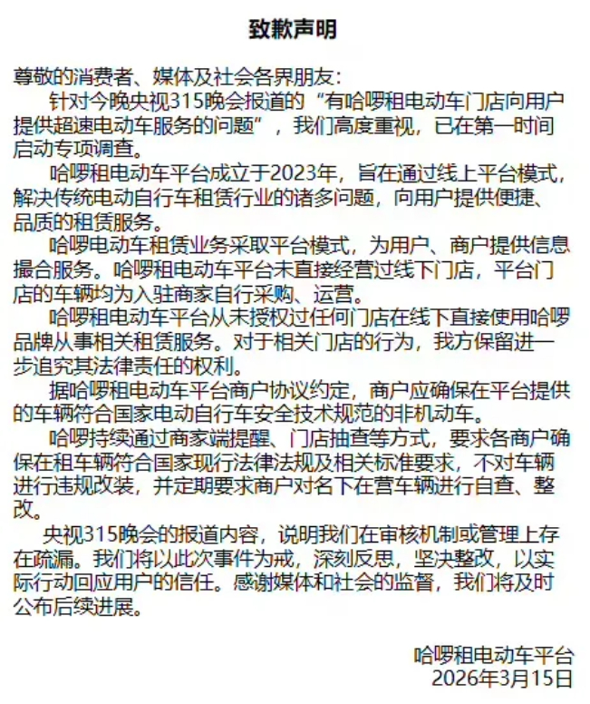 3月15日当晚,哈啰租电动车平台火速致歉,称“已启动专项调查”。上海市市场监管局也连夜进场核查,表态将依法严肃查处。