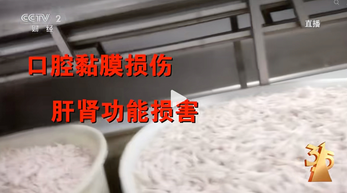 图源:央视网鸡爪“白净”卖相的背后,是双氧水(过氧化氢)在“漂白”,双氧水作为强氧化剂和消毒剂常常用于杀菌消毒。按国家标准,鸡爪加工严禁使用双氧水,长期食用会损伤口腔黏膜、肝肾功能,甚至危及生命。