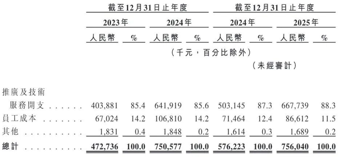 图源:《招股书》进一步细化来看,西子健康的销售费用由推广及技术服务开支、员工成本和其他三部分构成。其中推广及技术服务开支是主要费用,包括新媒体渠道、电子商务平台及线下营销活动的平台费用和开支,这部分费用各期分别为4.04亿元、6.42亿元和6.68亿元,分别占销售费用的85.4%、85.6%和88.3%。