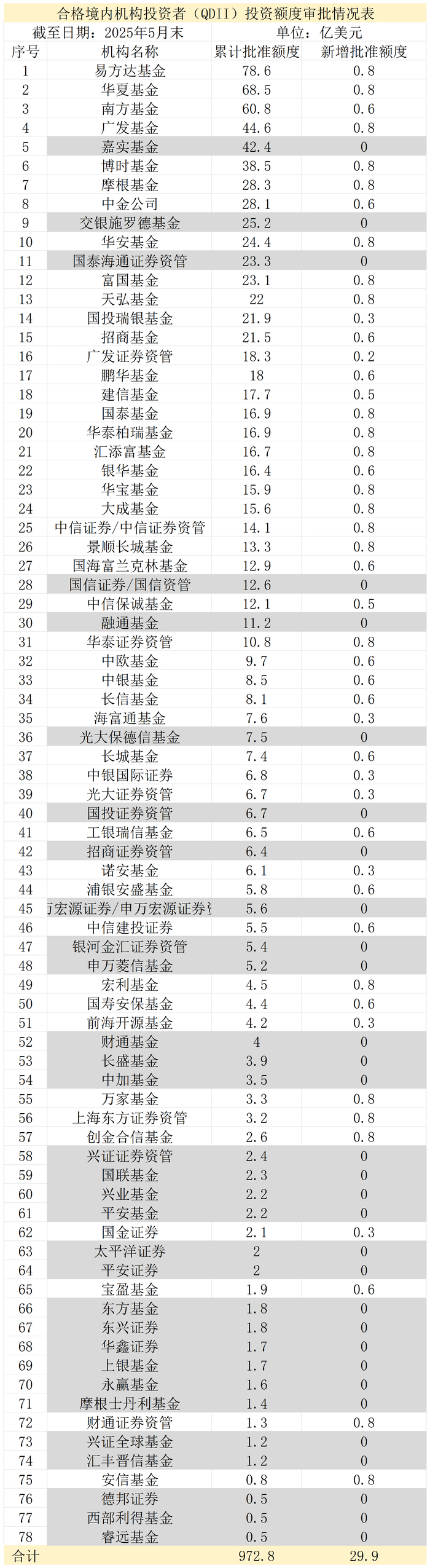 表:78家证券基金机构累计获批QDII额度明细表,标灰为本次未获批额度 来源:界面新闻整理从此次获批的额度来看,易方达基金、华夏基金、广发基金、博时基金、摩根基金等22家机构均获批0.8亿美元的额度,南方基金、中金公司、招商基金、鹏华基金、银华基金等15家机构均获批0.6亿美元额度,国投瑞银基金、海富通基金、中银国际证券、光大证券资管等7家机构均获批0.3亿美元额度,中信保诚基金、建信基金分别获批0.5亿美元额度,广发证券资管获批0.2亿美元额度。