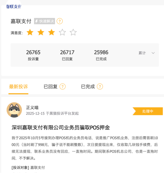 与此同时,在黑猫投诉[下载黑猫投诉客户端]上,关于嘉联支付的投诉帖高达26765个,大量指向骗取POS机押金、莫名扣费、虚假宣传等等,印证了上述业务漏洞。