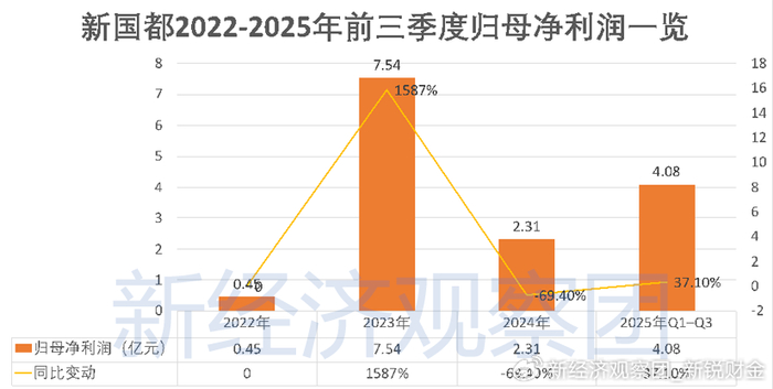 进入2025年后,利润数据进一步分化,前三季度新国都归母净利润为4.08亿元,同比增长37.1%,看似回暖;但扣除非经常性损益后的净利润仅为3.64亿元,同比下降33.0%。可见当前账面利润的增长并非源于核心业务改善,而是受到非经营性因素影响。