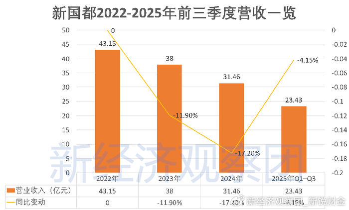 最直观的信号来自营收端的持续下滑。根据公司披露的年度财报,2022-2024年,新国都分别实现营业收入43.15亿元、38亿元和31.46亿元,其中2023年和2024年分别下跌11.9%和17.2%,跌幅逐渐扩大。进入2025年,新国都的下行趋势仍未扭转,上半年公司营收15.27亿元,同比下降3.1%;前三季度营收23.43亿元,同比继续下降4.15%,主营业务始终缺乏有效增长引擎。