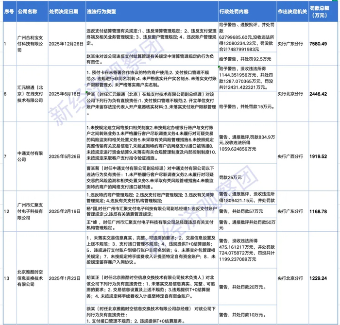 2025年8家被罚500-1000万的支付机构(含责任人被罚金额)制表:新经济观察团