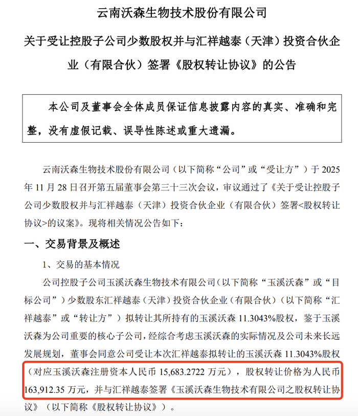 11月28日晚间,沃森生物公告,玉溪沃森少数股东汇祥越泰投资合伙企业拟转让其所持有的玉溪沃森 11.3043%股权,鉴于玉溪沃森为公司重要的核心子公司,经综合考虑玉溪沃森的实际情况及公司未来长远发展规划,董事会同意公司受让本次汇祥越泰拟转让的玉溪沃森 11.3043%股权,股权转让价格为人民币16.39亿元,并与汇祥越泰签署《玉溪沃森生物技术有限公司之股权转让协议》。