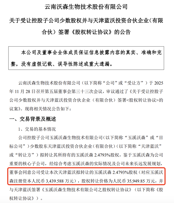 沃森生物同时公告,公司控股子公司玉溪沃森生物技术有限公司少数股东天津蓝沃投资合伙企业拟转让其所持有的玉溪沃森2.4793%股权,董事会同意公司受让本次天津蓝沃拟转让的玉溪沃森2.4793%股权,股权转让价格为人民币3.59亿元,并与天津蓝沃签署《玉溪沃森生物技术有限公司之股权转让协议》。