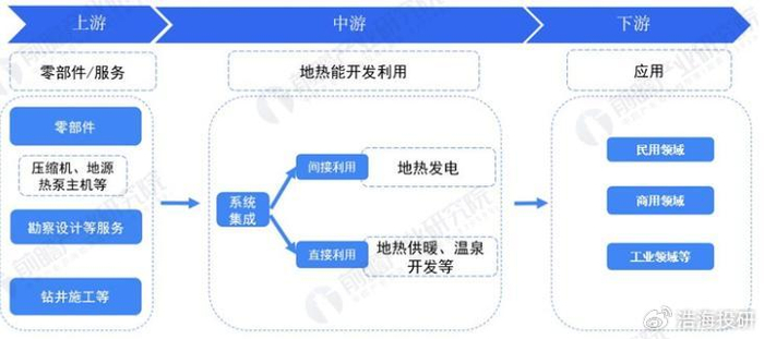 如果我们把地热产业链拆开,你会发现其上游是零部件生产,地质勘察、地热工程设计、施工等,中游为地热能开发利用,下游则是各类的应用领域。