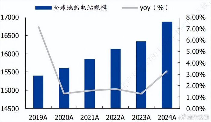以地热发电为例,如果我们把时间线拉长,你会发现近些年全球地热电站装机规模呈现稳步扩张态势,从2019年的刚过15GW,上升到2024年的16.9GW。其中,美国的地热电站装机量(大约有3.9GW)排名世界首位,其次是印度尼西亚和菲律宾两个国家。