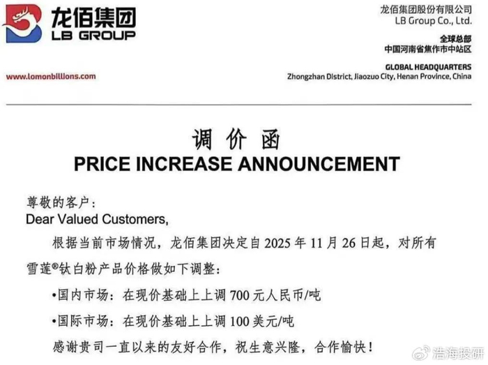 11月26日,#钛白粉 龙头#龙佰集团(002601)率先宣布国内产品每吨涨价700元,海外涨100美元。消息一出,#钛能化学(002145)、#道恩股份(002838)、#安纳达(002136)等20多家企业迅速跟进,连特诺、康诺斯这些外资巨头也坐不住了。年末这波钛白粉集体涨价,来得又快又猛。