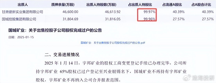 国城的问题远不止亏损这么简单。前两大股东质押率均超99.9%,总质押比例高达67.96%,几乎把全部持股都拿去融资,股票面临极高的抛售风险。2024年,公司高调宣布要收购亚洲最大银矿宇邦矿业,市场一度幻想它要打造稀贵金属平台,结果2025年突然反手卖掉65%股权,套现7.86亿元,这极有可能是公司由于财务困境而放弃了之前的战略布局。