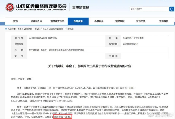 更令人警惕的是,国城在现金流恶化、存货上升、主业亏损的情境下,资产减值损失仍维持较低水平,因此存在减值异常现象。此外,公司此前就曾因信息披露方面存在瑕疵而被证监会出示过《警示函》,其风险信号已亮红灯。
