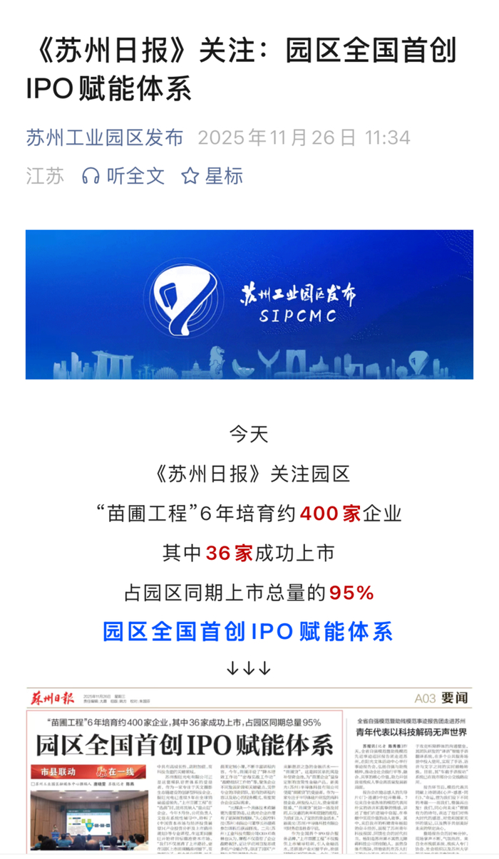 若说产业基础是苏州IPO领先的“底气”,那么一套从企业萌芽到上市的全周期培育体系,就是其“超车”的核心密码。2019年,苏州工业园区在全国率先推出“上市苗圃工程”,六年时间里,这套体系累计培育约400家企业,其中36家成功上市,占园区IPO总数的95%——换句话说,苏州工业园区几乎所有上市公司,都是从这套体系里“长”出来的。
