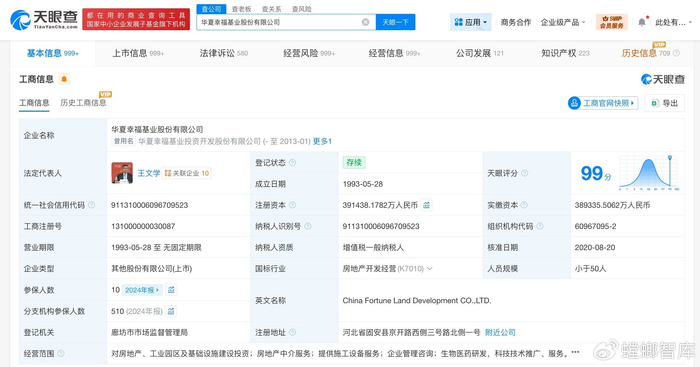 华夏幸福基业股份有限公司成立于1993年5月,法定代表人为王文学,注册资本约39亿人民币,经营范围包括对房地产、工业园区及基础设施建设投资,房地产中介服务等。股东信息显示,该公司由华夏幸福基业控股股份公司、香港中央结算有限公司等共同持股。天眼风险信息显示,该公司现存多条被执行人及股权冻结信息。
