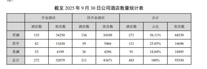 截至今年9月30日,君亭酒店公司旗下君澜、君亭、景澜三大酒店品牌合计开业数量272家、客房数52079间。加上待开业项目,合计酒店总数达483家,客房总数超过95000间。