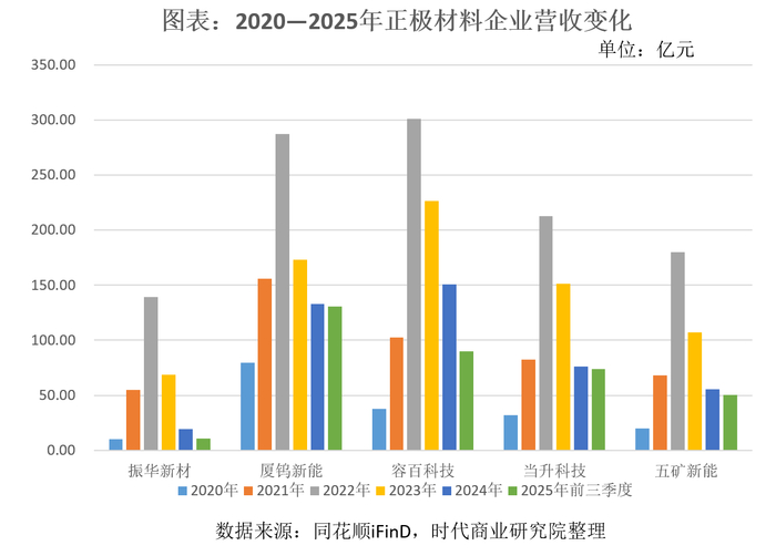 2022—2024年期间,振华新材的营收下滑幅度超过另外四家同行;而2025年前三季度,厦钨新能(688778.SH)、当升科技(300073.SZ)、五矿新能(688779.SH)均已实现业绩反弹,营收分别同比增长29.80%、33.92%、33.96%。